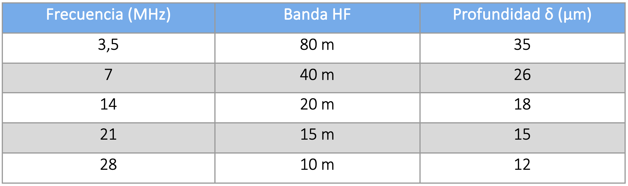 Estos valores evidencian que, incluso en la parte baja de HF, la corriente se concentra en una capa extremadamente delgada comparada con el diámetro típico de los conductores de antena.