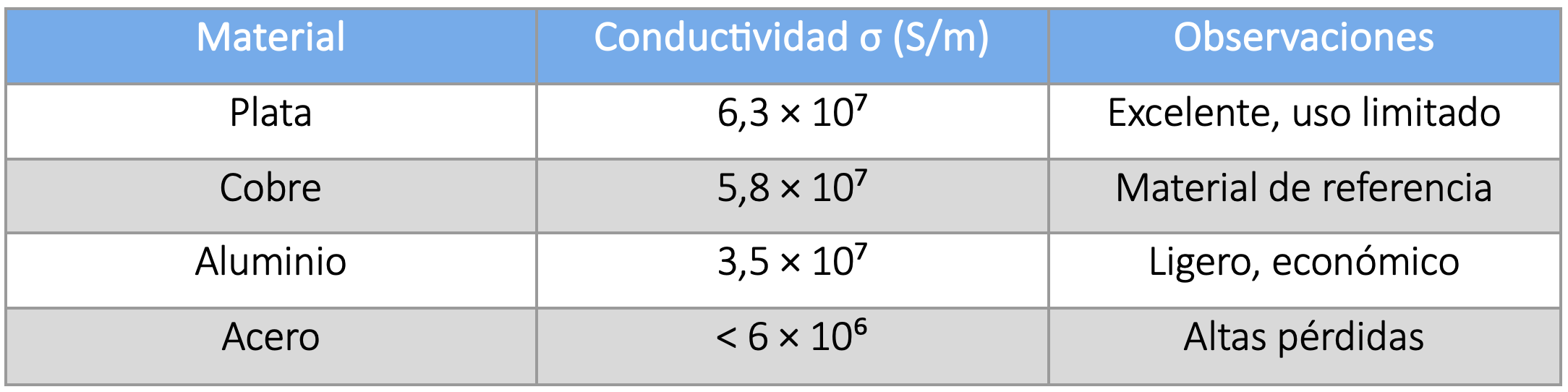 Los materiales ferromagnéticos presentan profundidades peliculares muy reducidas y pérdidas elevadas, por lo que no son adecuados como conductores radiantes.