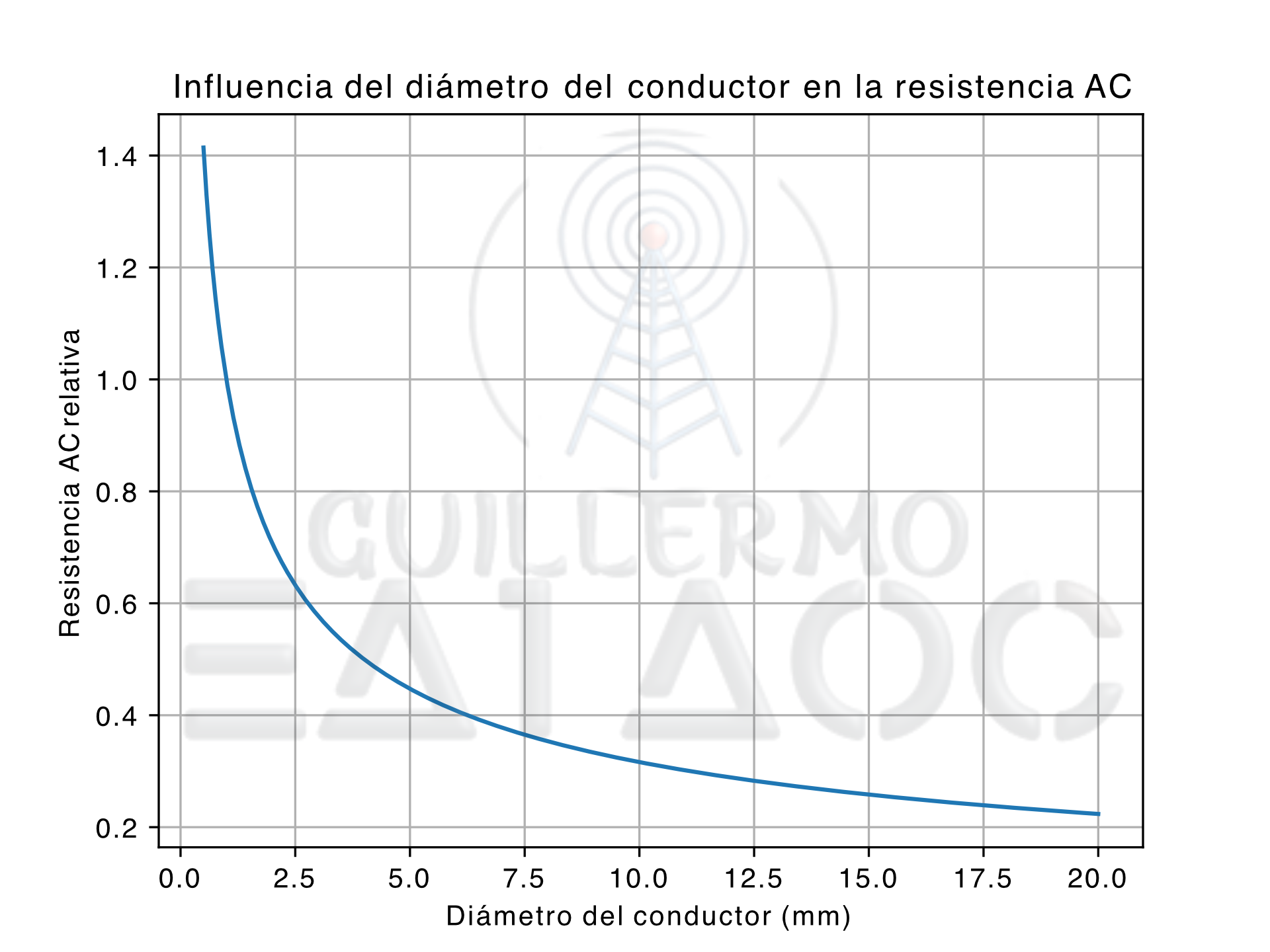 El aumento del diámetro reduce la resistencia AC, pero con rendimientos decrecientes. A partir de cierto valor, el incremento del diámetro aporta mejoras marginales frente al aumento de peso y coste.